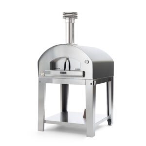 Forno con camera di cottura da 80×80 cm utili. Dotato di pratico carrello in acciaio inox con piano d’appoggio, canna fumaria dotata di valvola di regolazione dei fumi e cappello, porta di chisura della bocca fuoco. Il piano fuoco è realizzato in chamotte refrattaria di alta qualità e certificata per usi alimentari. La struttura interna è in acciaio inox mentre l’esterna è in acciaio elettrozincato trattato con vernici ad alta temperatura per la massima resistenza al calore, alle intemperie e alla ruggine. La coibentazione del forno è realizzata in lana di roccia naturale e permette di contenere la temperatura più efficacemente e di evitare che la struttura esterna si scaldi troppo.