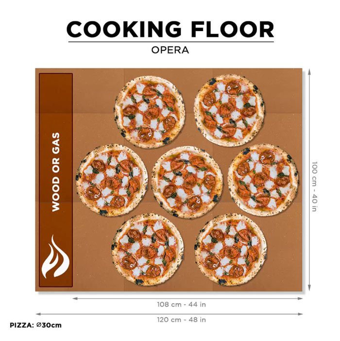 Opera è il forno a legna professionale più grande di tutta la gamma e dalle alte prestazioni. Disponibile sia con base che senza questo strumento di cottura professionale è perfetto per ogni tipologia di attività ristorativa. Ottimo per il moderno front-cooking grazie al design unico, che rende il forno parte integrante dell’arredo del locale, questo forno professionale per pizza sforna fino a 150 pizze in un’ora e cuoce un infornata di 7 pizze per volta in meno di 90 secondi.